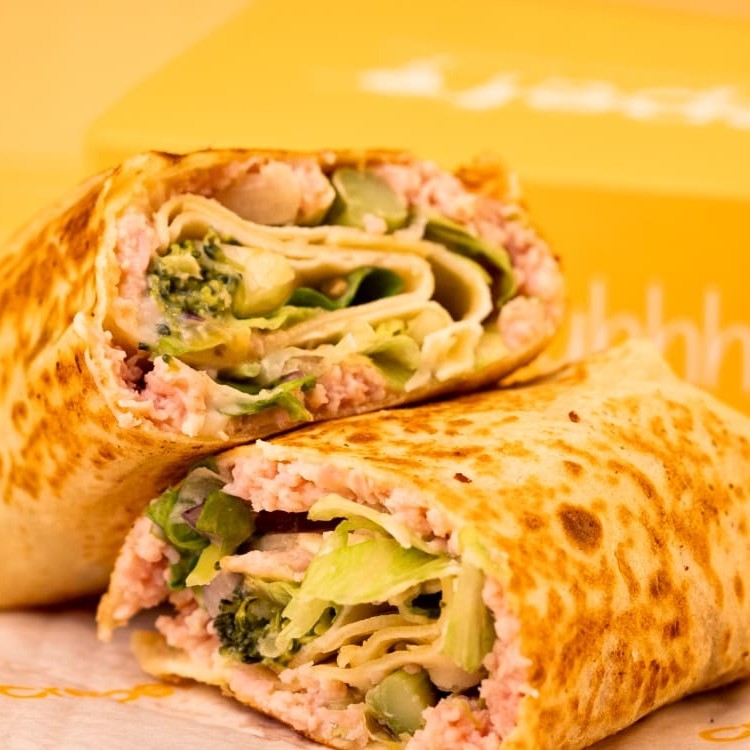 Wrap especial com Peito de peru, rúcula e folhas de alface americana frescas, tomate picado, brócolis refogado no azeite e cebola roxa.