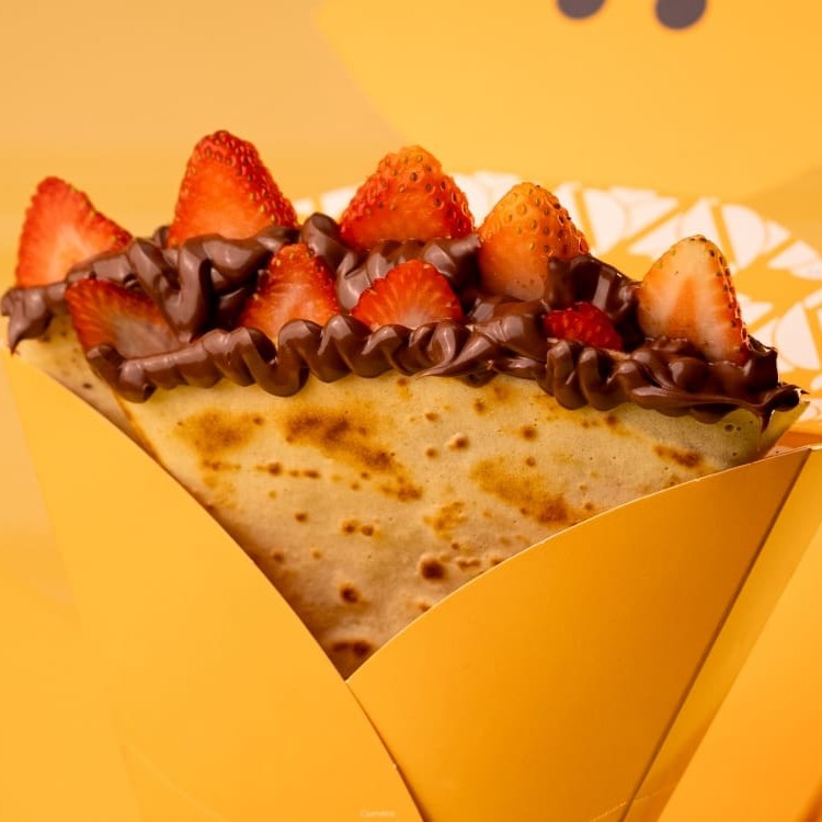 Crepe recheado com generosa porção de creme de avelã (Nutella) + porção de morangos selecionados. Esse crepe serve uma pessoa. Geralmente, nossos clientes comem de 2 salgados, 1 doce + 1 bebida e ficam extremamente satisfeitos.