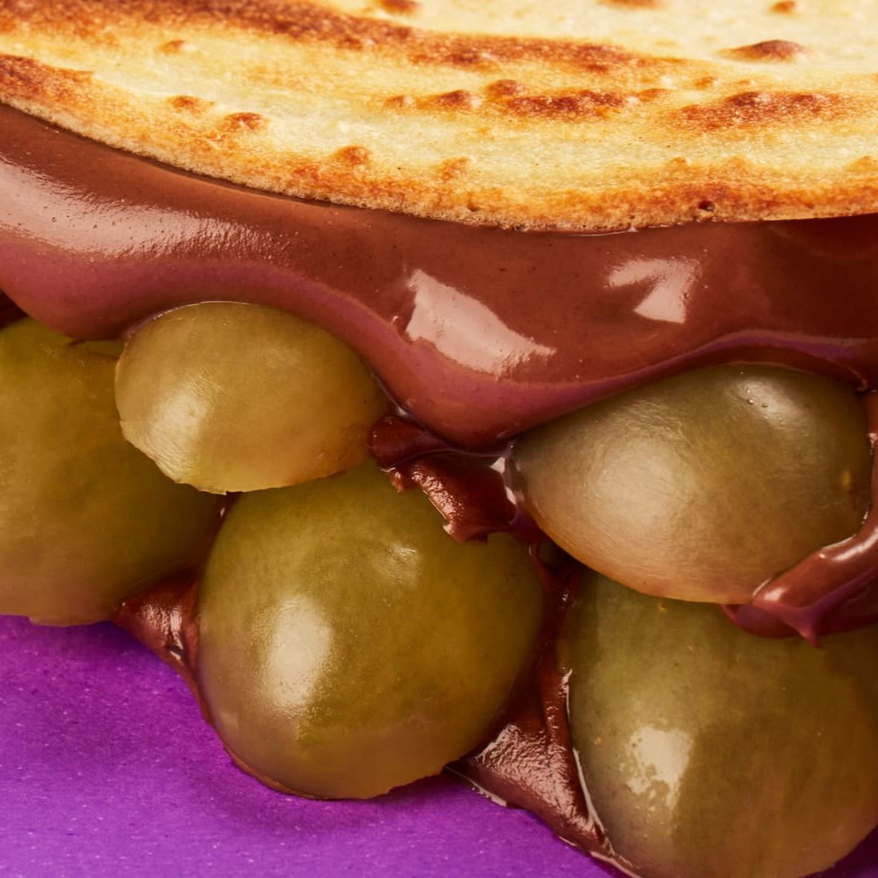 Crepe recheado com generosa porção de creme de avelã (Nutella) + porção de uvas selecionadas. Esse crepe serve uma pessoa. Geralmente, nossos clientes comem de 2 salgados, 1 doce + 1 bebida e ficam extremamente satisfeitos.