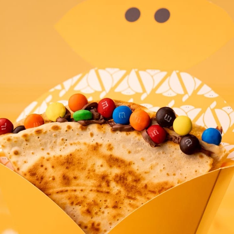 Crepe absurdamente recheado com chocolate cremoso e confetes M&M’s. Esse crepe serve uma pessoa. Geralmente, nossos clientes comem de 1 salgado, 1 doce + 1 bebida e ficam extremamente satisfeitos.