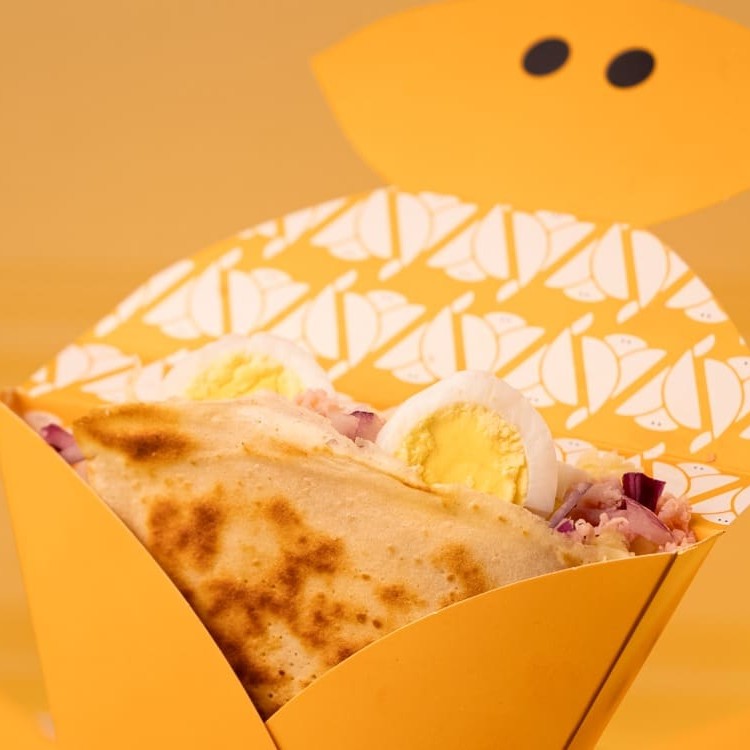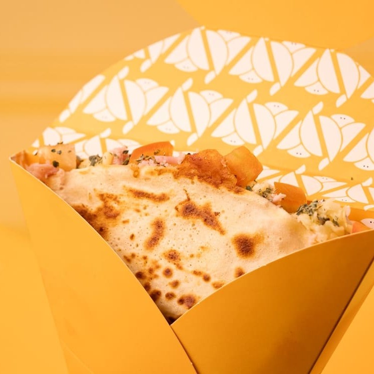 Crepe recheado com generosas fatias de presunto, queijo mozarela, ovo e um toque de cebola picada. Esse crepe serve uma pessoa. Geralmente, nossos clientes comem de 1 salgado, 1 doce + 1 bebida e ficam extremamente satisfeitos.