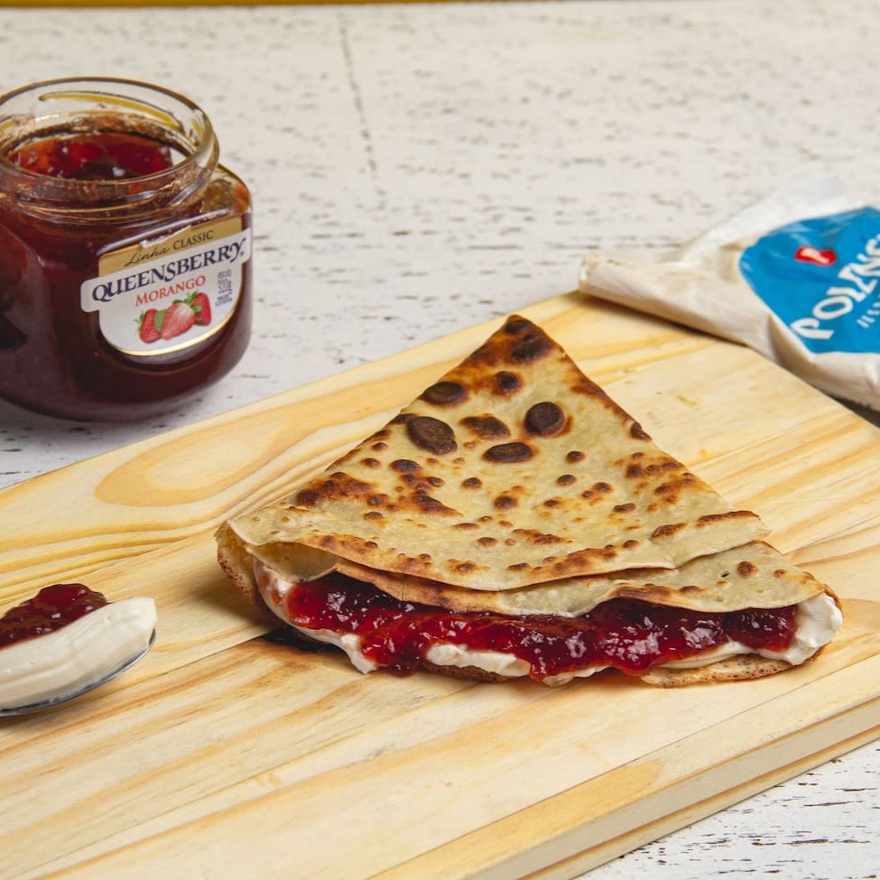 Crepe recheado com cream cheese e uma generosa porção de geleia de frutas vermelhas (ou morango). Esse crepe serve uma pessoa. Geralmente, nossos clientes comem de 2 salgados, 1 doce + 1 bebida e ficam extremamente satisfeitos.