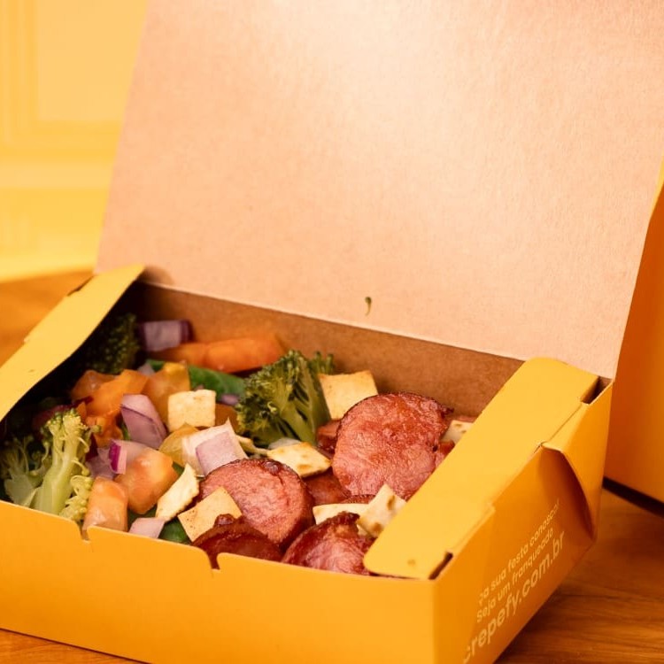 Mix de folhas frescas com tomates, cebola roxa finamente fatiados, brócolis refogado no azeite extra virgem, cebola roxa, mozzarella em cubos, rodelas de calabresa fatiadas e deliciosos Croutons de crepe.