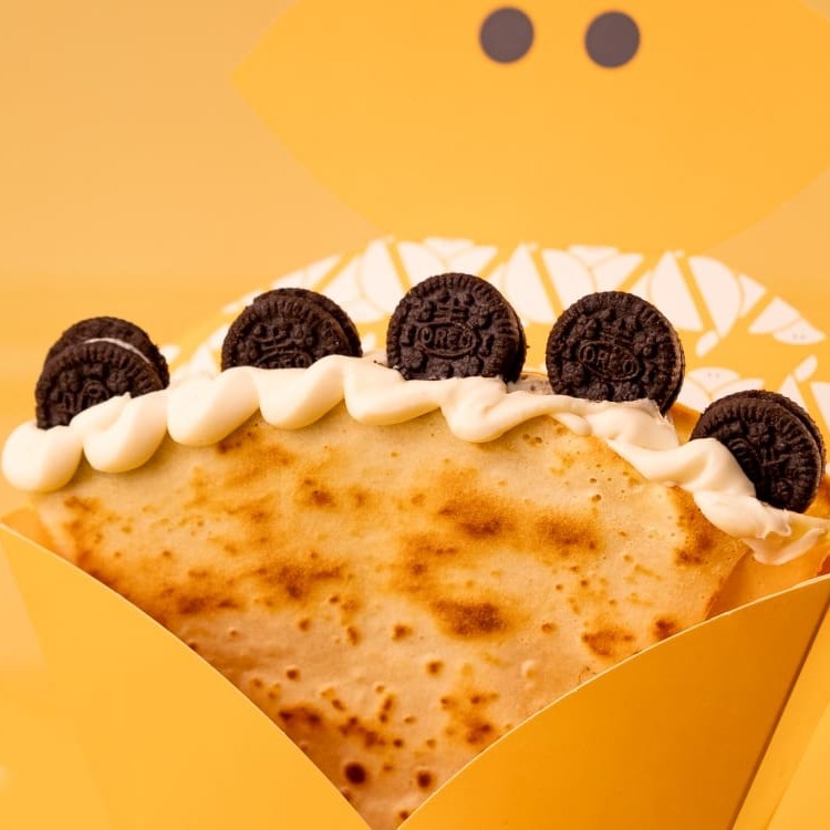 Crepe recheado com Pedaços de Biscoito Oreo em uma base de chocolate Branco, finalizados saboros mini Oreo (Original).