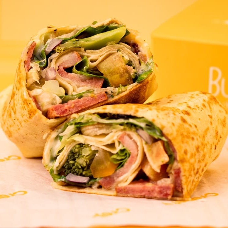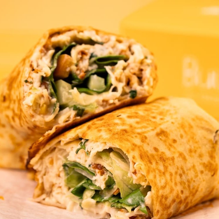 Wrap Saudável, recheado com porções de frango com Catupiry, milho, azeitona, rúcula e folhas de alface americana frescas, tomate picado, brócolis refogado no azeite e cebola roxa.
