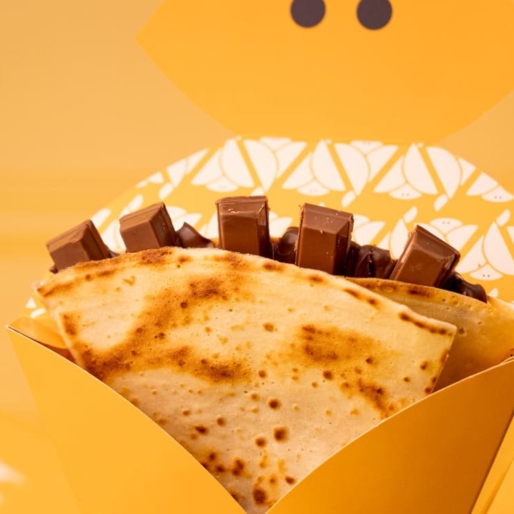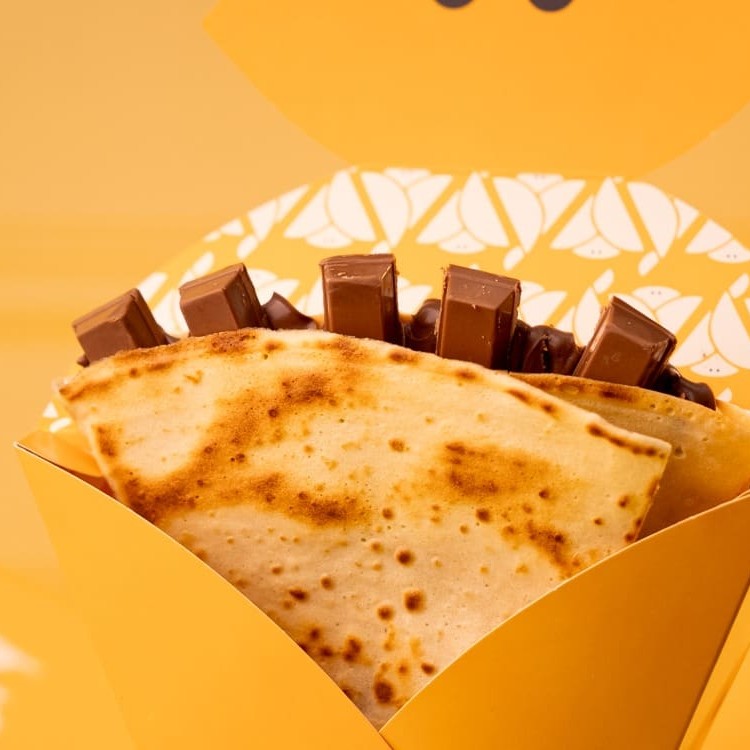 Crepe recheado com uma porção generosa de chocolate ao leite e suculentos Pedaços de chocolate Suflair (Original) envolvidos em uma massa fininha e crocante.