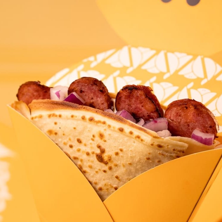 Crepe pincelado com molho de tomate, recheado com saborosa calabresa cuidadosamente picada, finalizado com um toque de cebola. Esse crepe serve uma pessoa. Geralmente, nossos clientes comem de 2 salgados, 1 doce + 1 bebida e ficam extremamente satisfeitos.