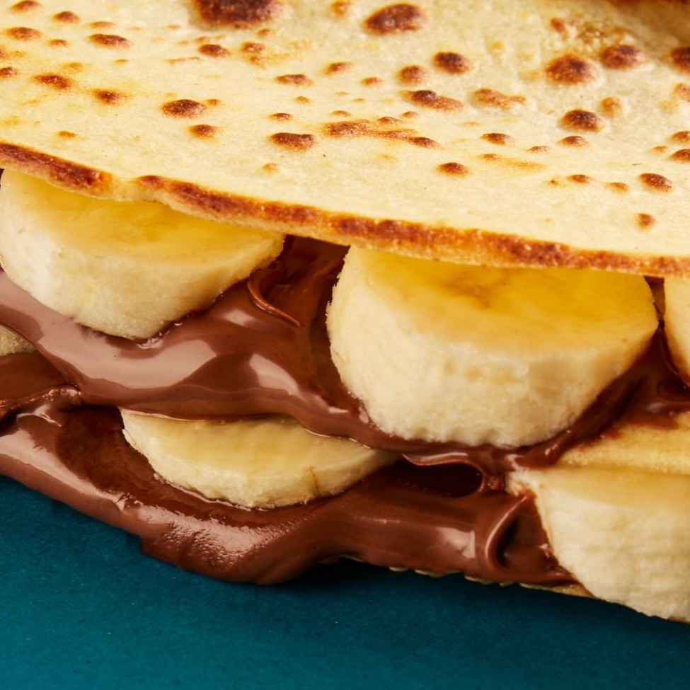 Crepe recheado com generosa porção de creme de avelã (Nutella) + porção de bananas. Esse crepe serve uma pessoa. Geralmente, nossos clientes comem de 2 salgados, 1 doce + 1 bebida e ficam extremamente satisfeitos.