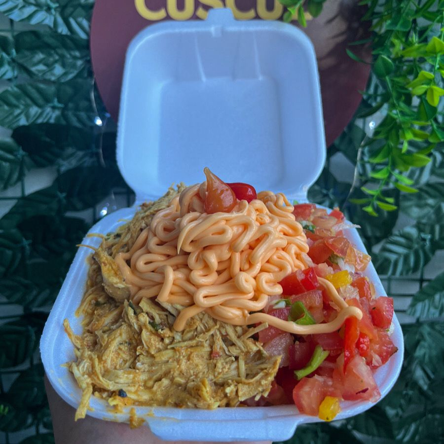 Descubra o sabor indescritível do nosso 'Cuscuz de Frango no Copo'. Este prato é uma mistura harmoniosa de cuscuz macio e suavemente temperado, enriquecido com pedaços generosos de frango tenro, cuidadosamente cozidos. A adição do vinagrete fresco e picante, juntamente com o requeijão cremoso e derretido, eleva este prato a um novo nível de satisfação culinária. Um prazer para o paladar, este cusc