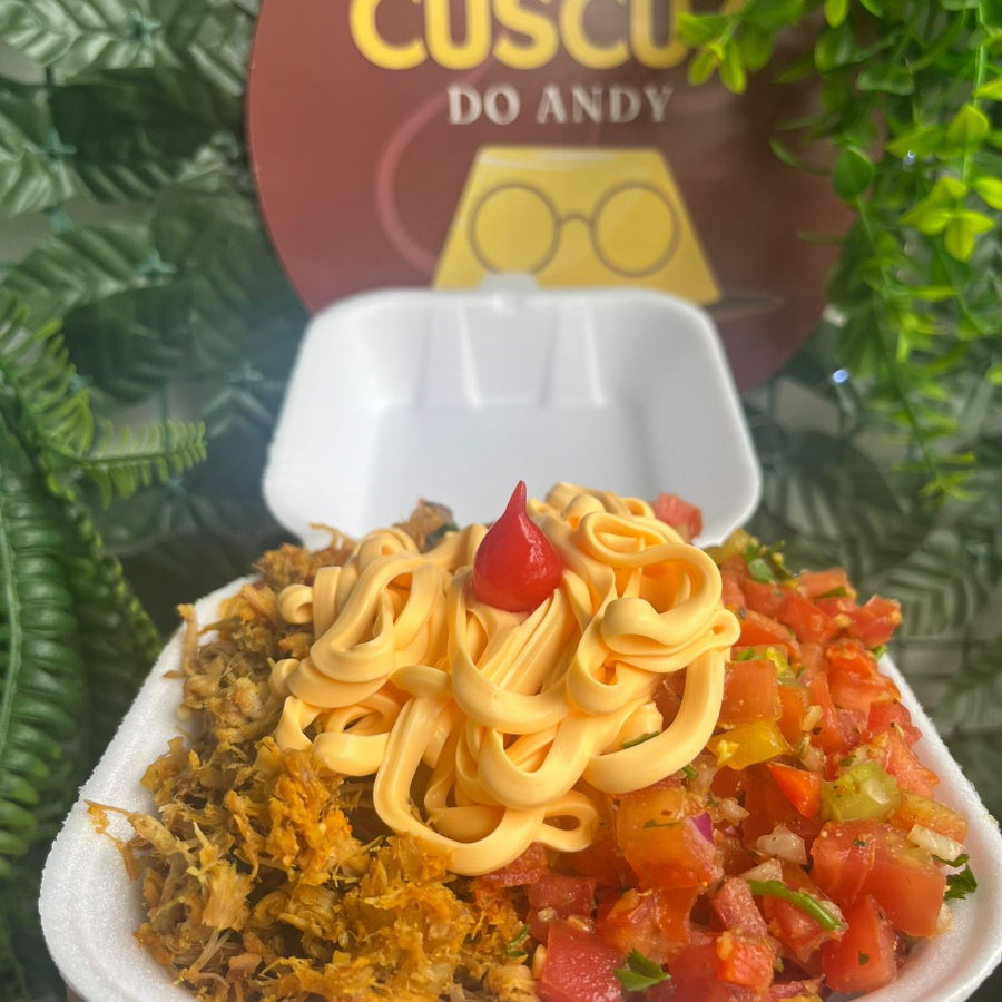 O nosso 'Cuscuz de Pernil' se insere na cativante categoria 'Cuscuz no Pote'. Este prato apresenta uma combinação harmoniosa de cuscuz macio, preparado na medida certa, com generosas lascas de pernil suculento e bem temperado. Para complementar, um leve toque de vinagrete fresco e aromático, que adiciona um sabor cítrico e picante, equilibrando perfeitamente com a suavidade do cuscuz e do pernil.