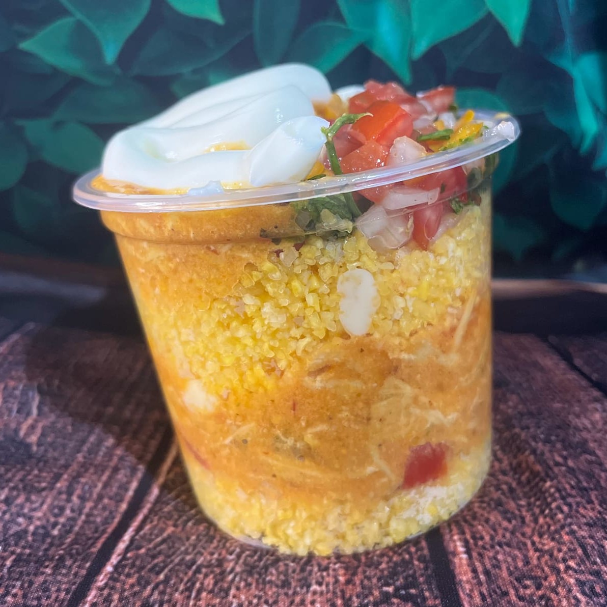 Descubra o sabor indescritível do nosso 'Cuscuz de Frango no Copo'. Este prato é uma mistura harmoniosa de cuscuz macio e suavemente temperado, enriquecido com pedaços generosos de frango tenro, cuidadosamente cozidos. A adição do vinagrete fresco e picante, juntamente com o requeijão cremoso e derretido, eleva este prato a um novo nível de satisfação culinária. Um prazer para o paladar, este cusc
