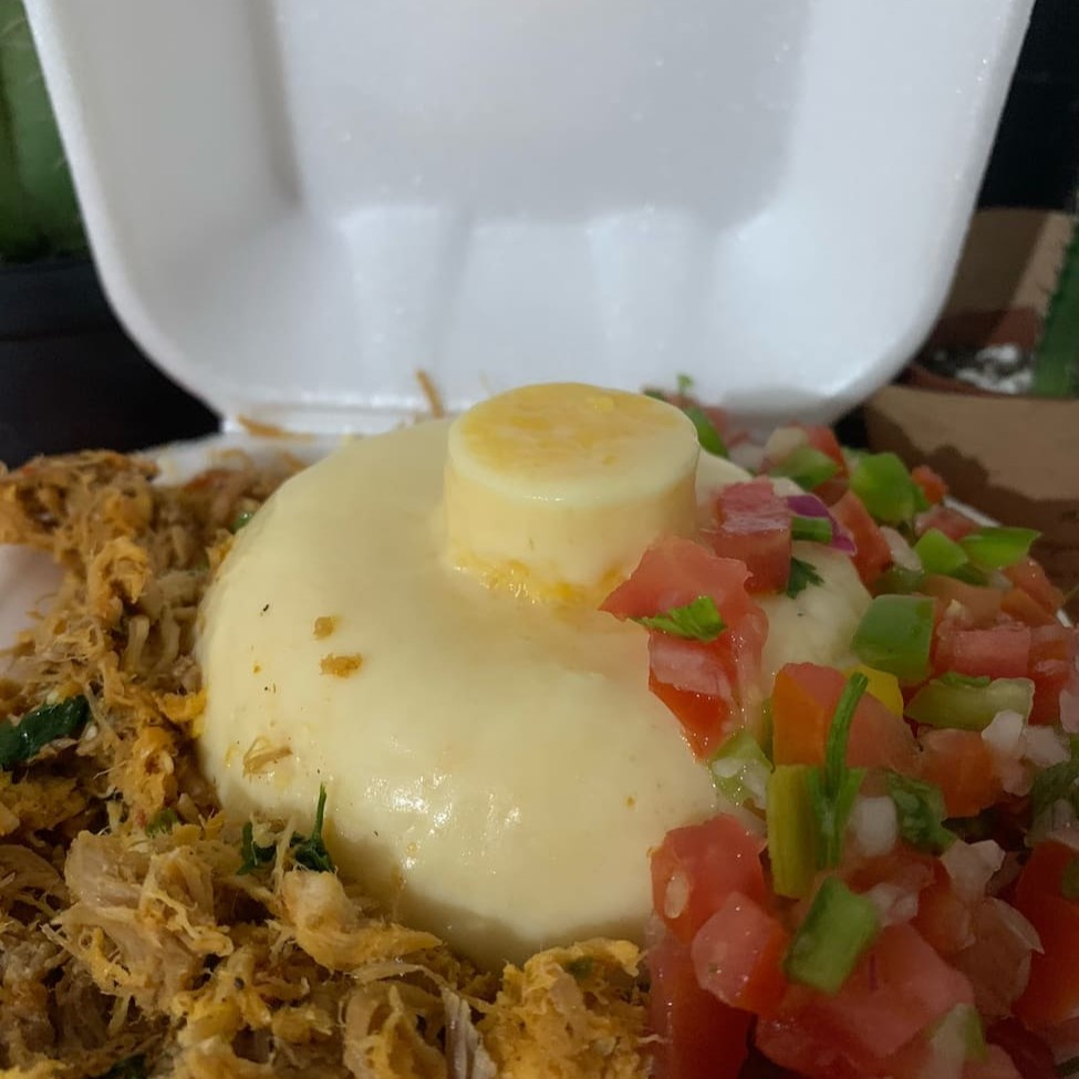 Cuscuz recheado com pernil, requeijão cremoso e vinagrete