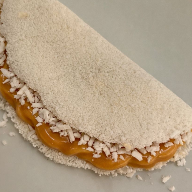Tapioca recheada de doce de leite e coco em flocos