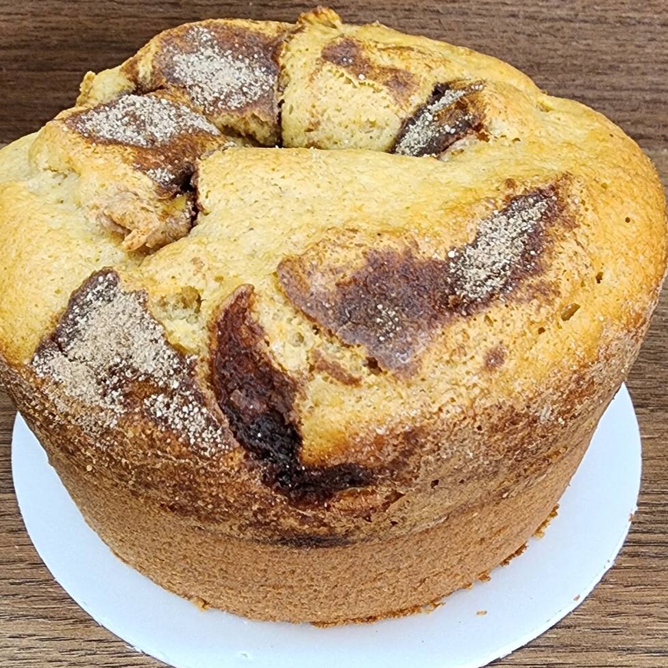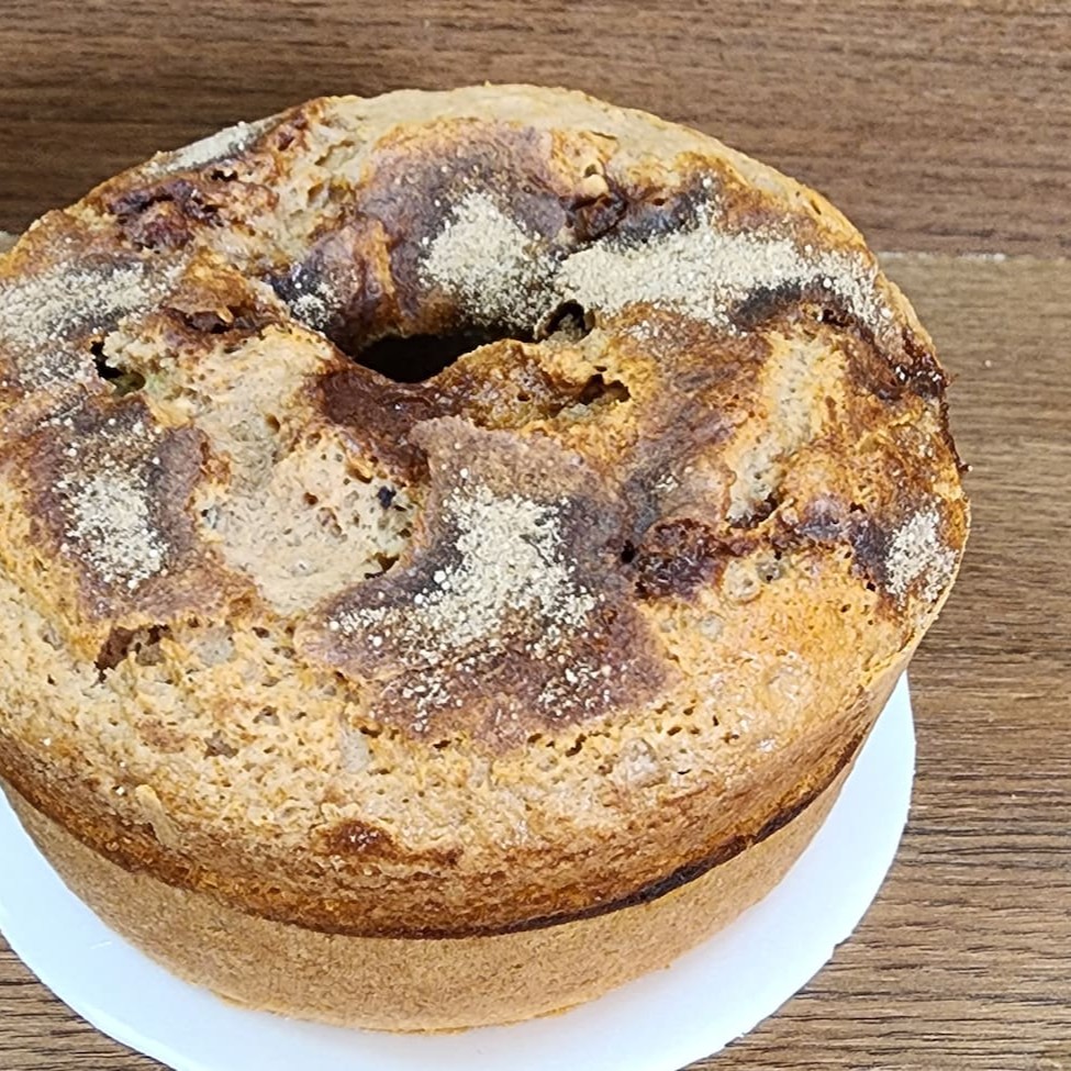 Bolo caseiro com banana em rodelas, canela e chocolate na massa.