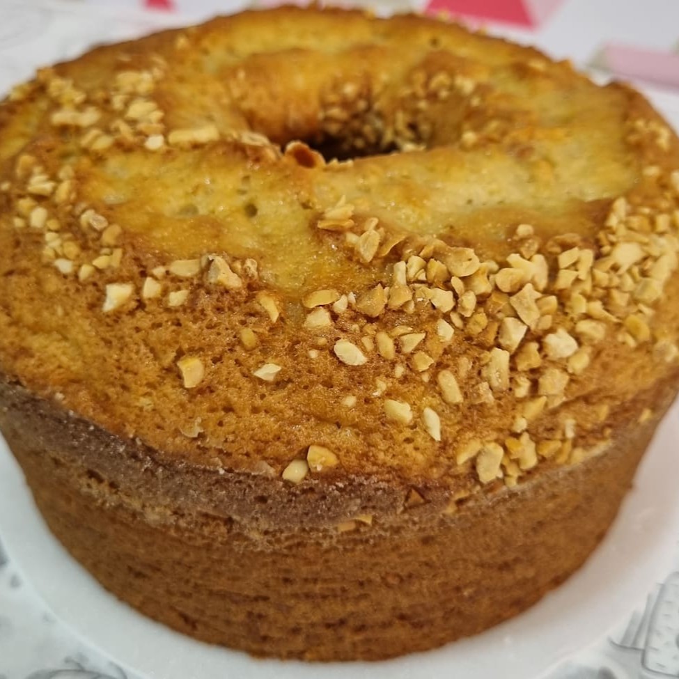 Bolo caseiro feito com paçoca na massa e amendoim por cima.