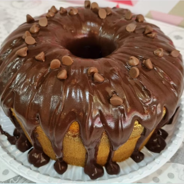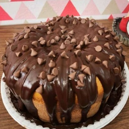 Nosso bolo caseiro de cenoura todo coberto de chocolate e gotas de chocolate.