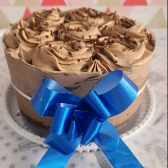 Massa de chocolate com recheio de creme de chocolate e coberto com creme de chocolate. Não é possível escolher a cor do laço. De acordo com disponibilidade.