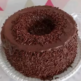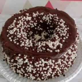Bolo caseiro de chocolate com cobertura de chocolate e granulado
