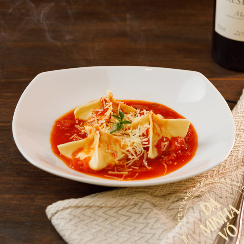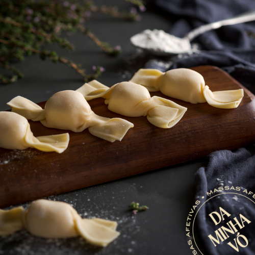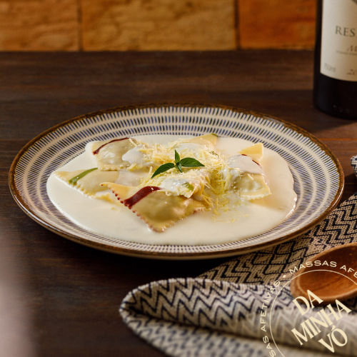Massa delicada em formato elegante, recheio cheio de afeto e sabor. ➡️ Massa congelada e de fácil preparo. Serve de 2 a 3 pessoas (450g). Molhos vendidos separadamente.