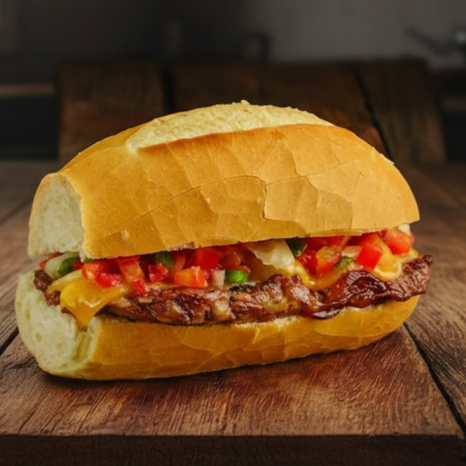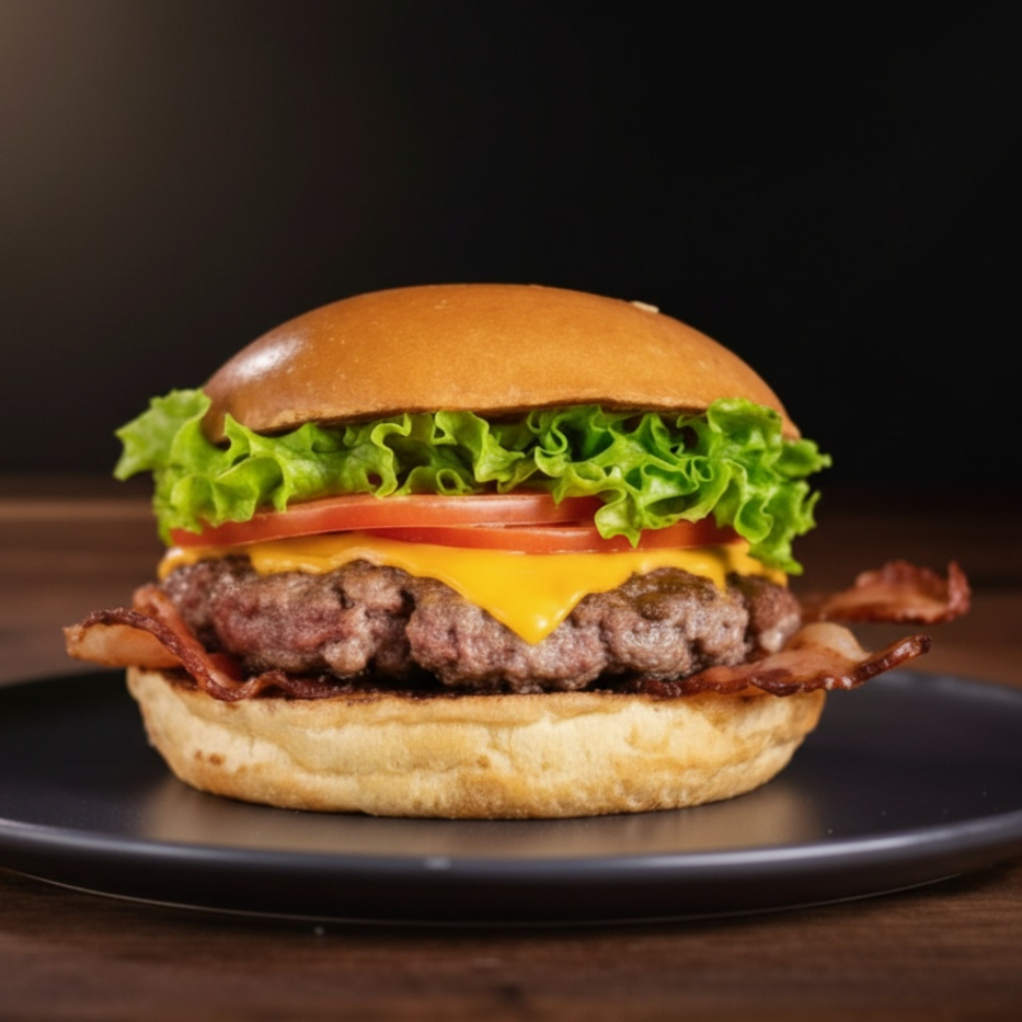 Pão, hambúrguer, bacon, alface, maionese, queijo prato, tomate cozido