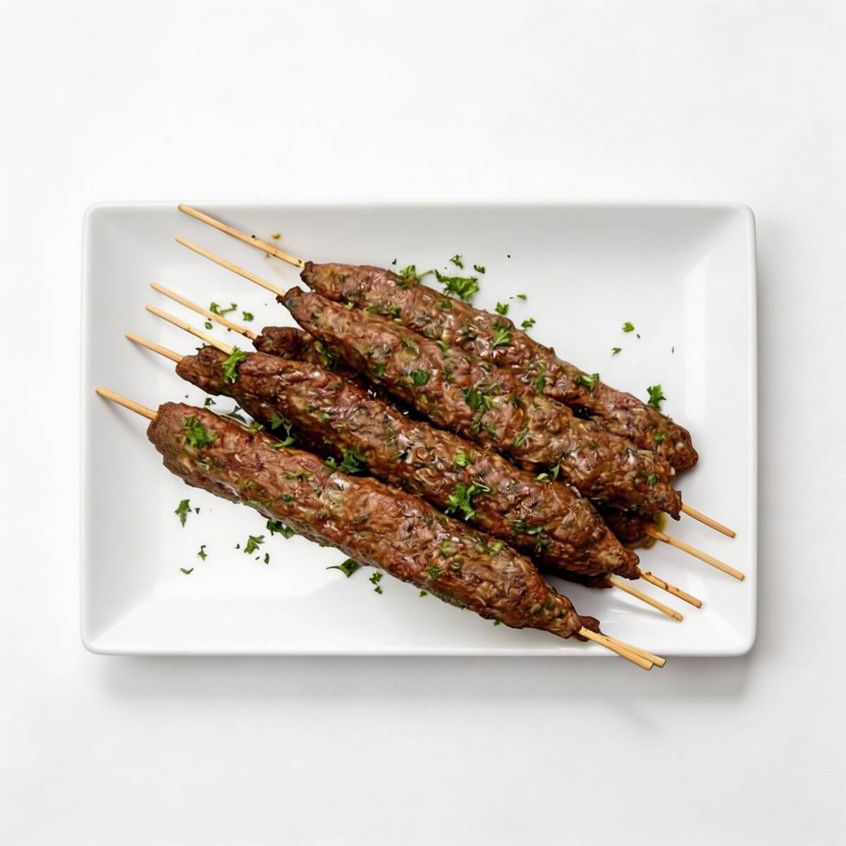 Um prato que tem 3 espetinhos de kebab.Enrolado grelhado de carne temperada com nossos temperos arabe originais.Acompanha molho da casa