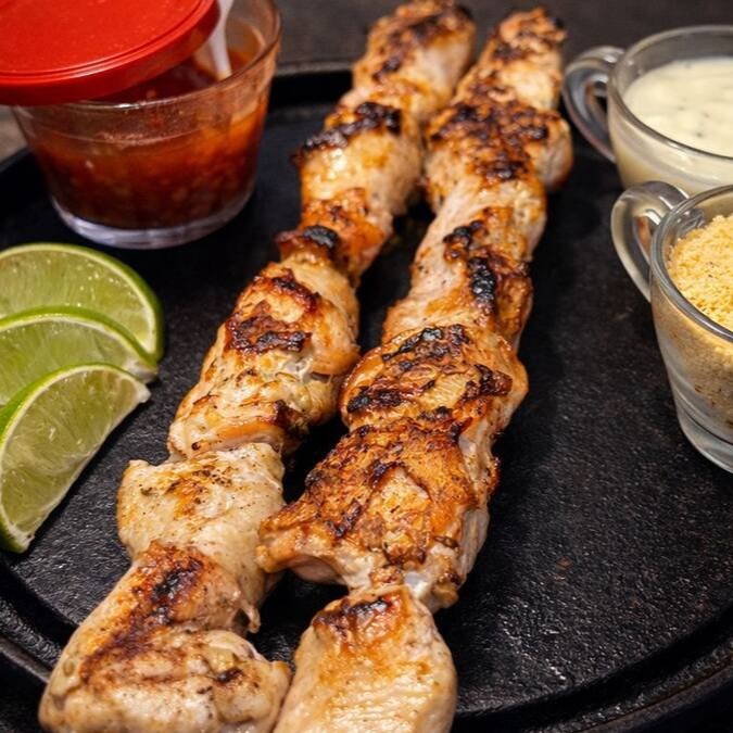 Espeto Gigante Misto De Peito De Frango Com Contra Filé | Molho De Alho + Farofa