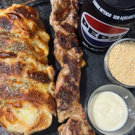 Sabor inconfundível no nosso Espeto Misto, que combina contra-filé macio e linguiça toscana suculenta, acompanhados de um delicioso pão de alho caseiro. Para completar, você recebe uma lata de Pepsi gelada, molho de alho caseiro e farofa crocante. A combinação perfeita de carnes grelhadas e acompanhamentos para uma refeição irresistível e cheia de sabor!