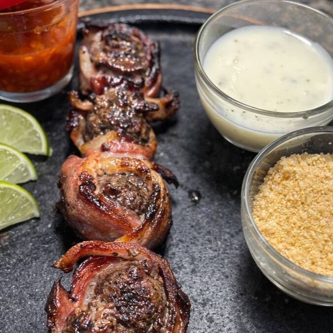Preparado na brasa, o filé de frango fica macio e suculento, envolvido por bacon dourado, que traz aquele toque defumado irresistível do churrasco.