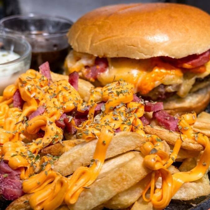 Hambúrguer artesanal de costela na brasa 300gr gigante com cheddar ,mussarela ,bacon ou calabresa e batata frita com cheddar ,calabresa fatiada e molho de alho top demais