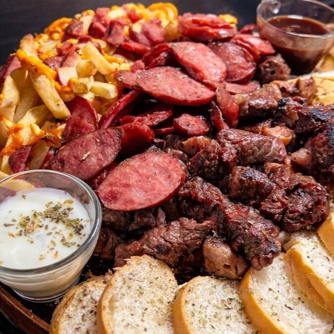 A Porção Mista Gigante é para quem busca a combinação perfeita de sabores! Com pedaços generosos de contra filé, calabresa suculenta, sobrecoxa macia e batata crinkle crocante, tudo isso acompanhado de pão fresquinho, cheddar cremoso e bacon crocante. Para dar aquele toque final, nosso exclusivo molho de alho caseiro vai deixar tudo ainda mais irresistível. Uma refeição farta e cheia de sabor, ideal para quem não abre mão de um churrasco completo e saboroso!