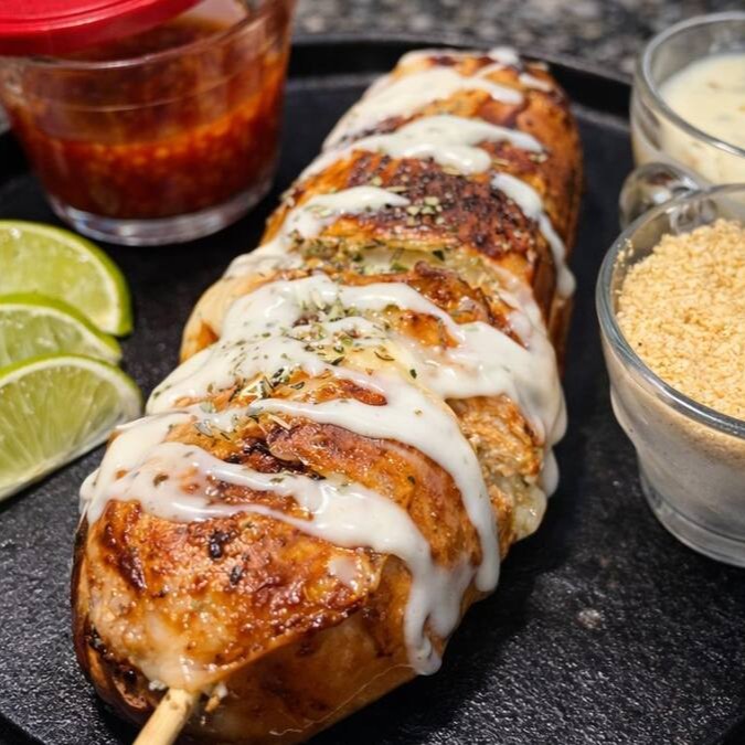 O Espeto Gigante de Pão de Alho Caseiro com Mussarela é preparado com pão de alho fresquinho, assado na brasa até ficar crocante por fora e macio por dentro.