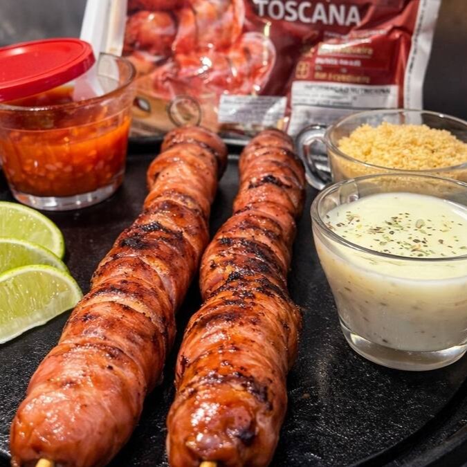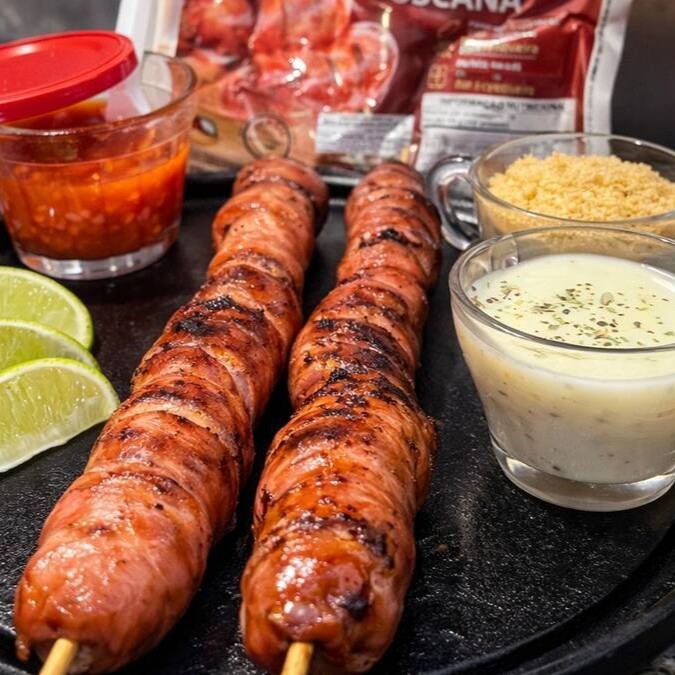 Experimente o Espeto Gigante de Linguiça Toscana Aurora, preparado na brasa para garantir sabor e suculência em cada mordida