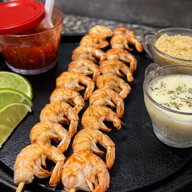 Camarões selecionados, assados no ponto certo para ficarem macios, suculentos e com leve toque defumado do churrasco.