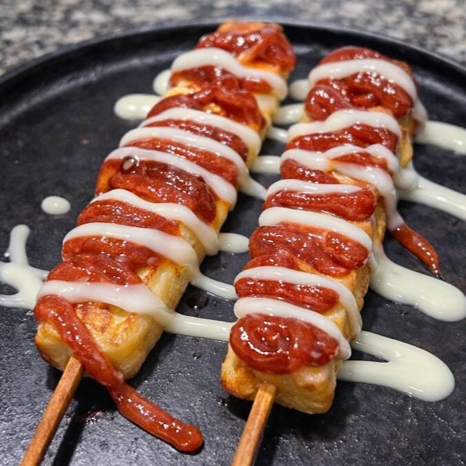 Espeto de kafta artesanal, disponível nos sabores carne, frango ou pernil, recheada com mussarela derretida e assada na brasa