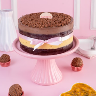 Massa de chocolate fofinha, bem molhadinha. Recheio de mousse de maracujá e cobertura de brigadeiro tradicional, finalizado com granulado belga ao leite. Rendimento: de 8 a 10 fatias. Tamanho: 15cm de diâmetro por 7cm de altura. Peso médio: 1kg