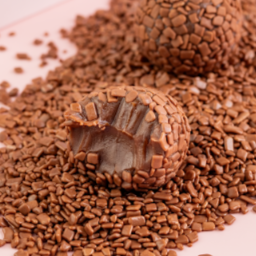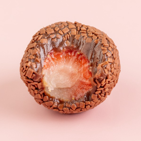 Brigadeiro tradicional, com morango selecionado, envolto no granulado belga Callebaut. Peso médio: 100g