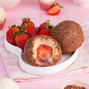 Brigadeiro de ninho, com morango selecionado, envolto no granulado belga Callebaut. Peso médio: 90g.
