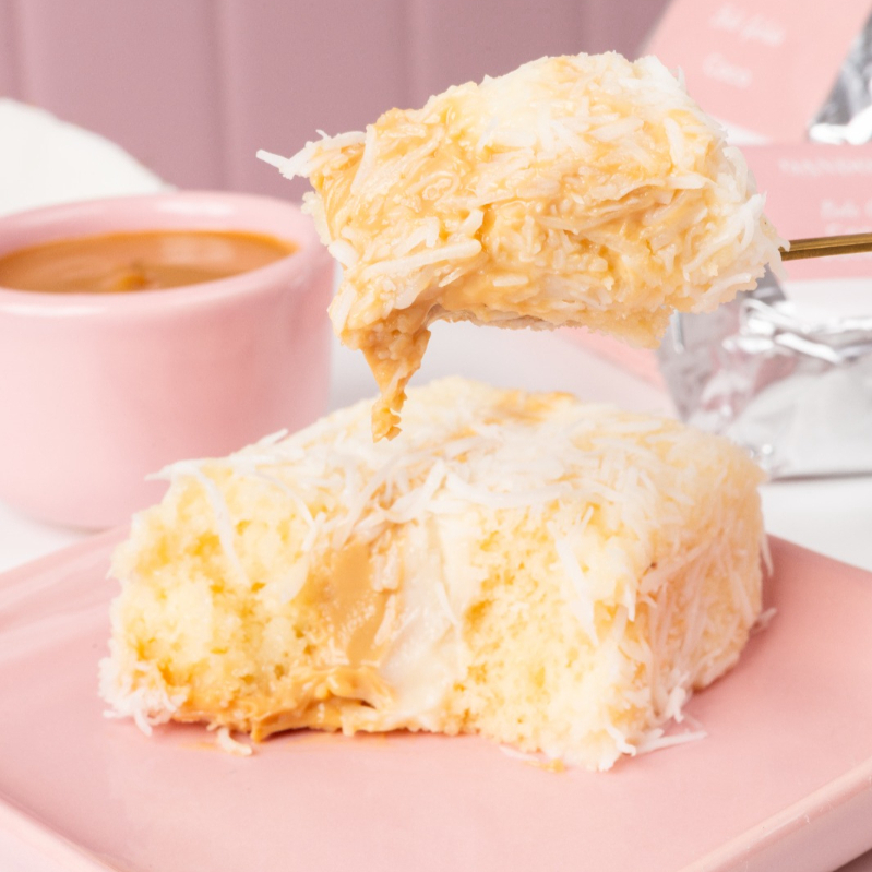 Massa fofinha, molhada com calda especial de coco, recheio de doce de leite com ameixa e coco cremoso, finalizado no coco ralado. Peso médio - 100g
