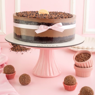 Massa de chocolate fofinha, bem molhadinha. Recheio de brigadeiro de leite Ninho e cobertura de brigadeiro tradicional, finalizado com mix de granulado belga ao leite e branco. Rendimento: de 8 a 10 fatias. Tamanho: 15cm de diâmetro por 7cm de altura. Peso médio: 1kg