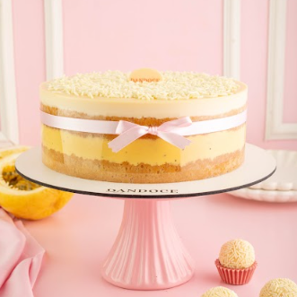 Massa branca fofinha, bem molhadinha. Recheio de mousse de maracujá e cobertura de ninho, finalizado com granulado de chocolate branco. Rendimento: de 8 a 10 fatias. Tamanho: 15cm de diâmetro por 7cm de altura. Peso médio: 1kg