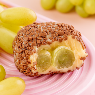 Brigadeiro de ninho cremoso, intercalado com uva verde selecionada. Finalizada com ganache de chocolate e granulado belga. Rendimento estimado para 4 pessoas. Peso médio 600g.