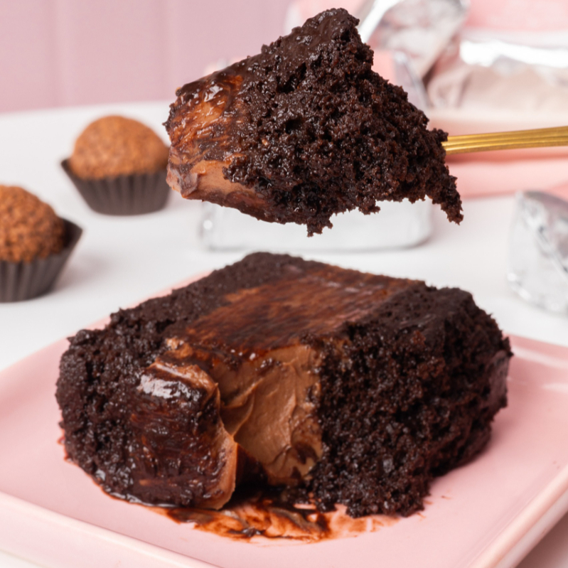 Massa de chocolate fofinha, super molhadinha, com recheio de chocolate meio amargo. Finalizado no cacau 100%.