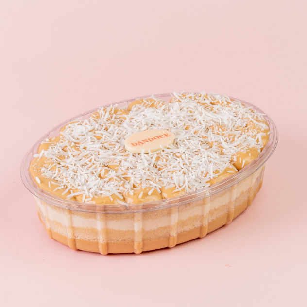 Massa branca fofinha, regada com nossa calda especial de coco. Recheio de doce de leite suave e coco cremoso, finalizado com doce de leite e coco ralado. Rendimento: de 18 a 20 fatias. Tamanho: 20cm de diâmetro por 7cm de altura. Peso médio: 2kg