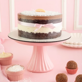Massa de chocolate fofinha, bem molhadinha. Recheio de coco cremoso e cobertura de brigadeiro tradicional, finalizado com coco ralado. Rendimento: de 18 a 20 fatias. Tamanho: 20cm de diâmetro por 7cm de altura. Peso médio: 2kg
