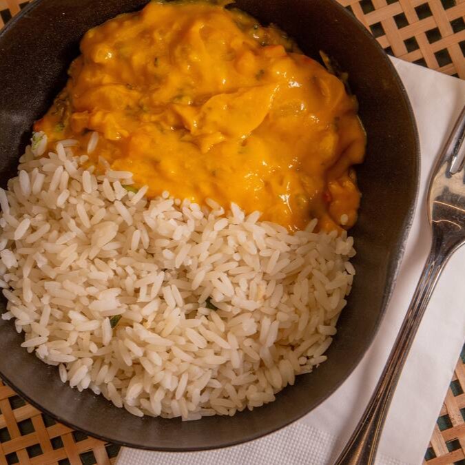 Camarão salgado, leite de coco e azeite de dende com arroz branco