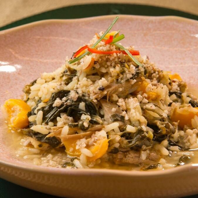 Arroz com lascas de pato, tucupi, pupunha e castanha do Pará.
