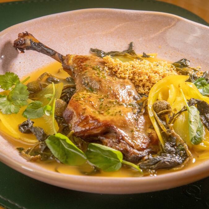 Coxa e sobrecoxa de pato com molho de tucupi e jambu acompanhado de arroz branco.
