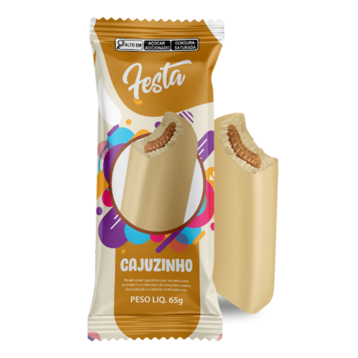 Picolé sabor cajuzinho com recheio sabor amendoim e cobertura de chocolate branco