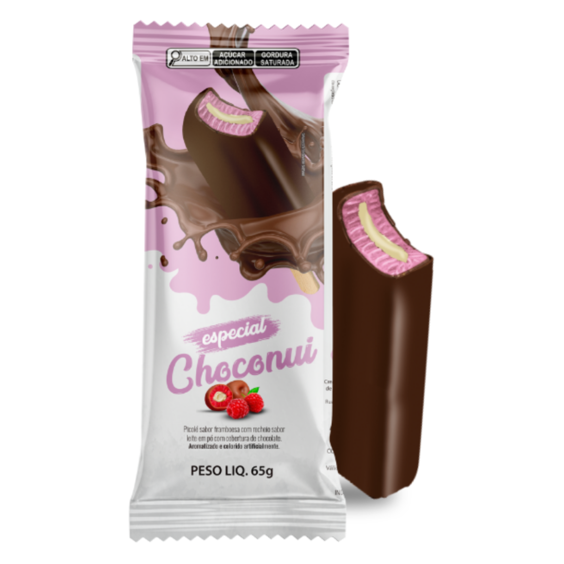 Picolé sabor framboesa com recheio sabor leite em pó com cobertura de chocolate