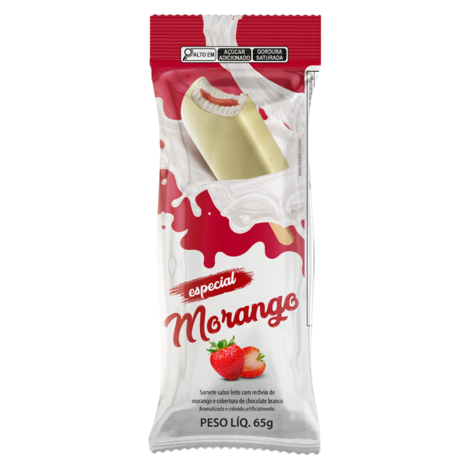 Picolé sabor leite com recheio de morango e cobertura de chocolate branco